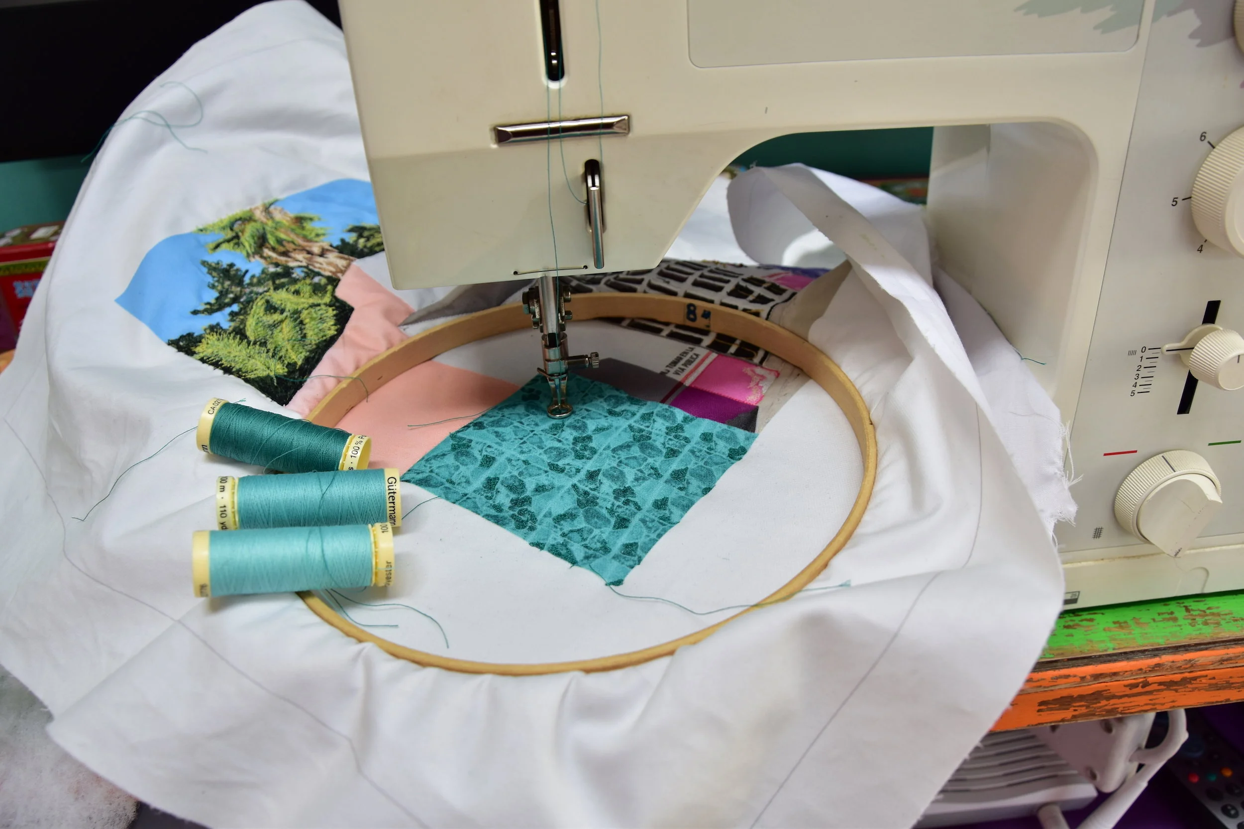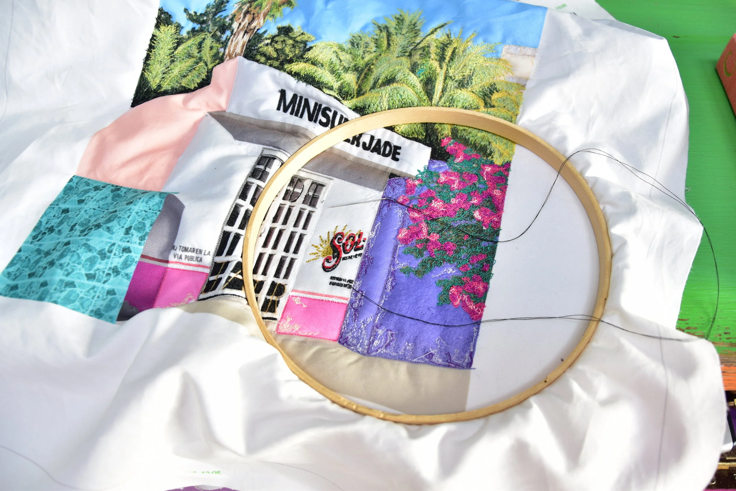 Cleo created a digital collage of imagery from a trip to Holbox, Mexico, and used a sewing machine to embroider the canvas.
