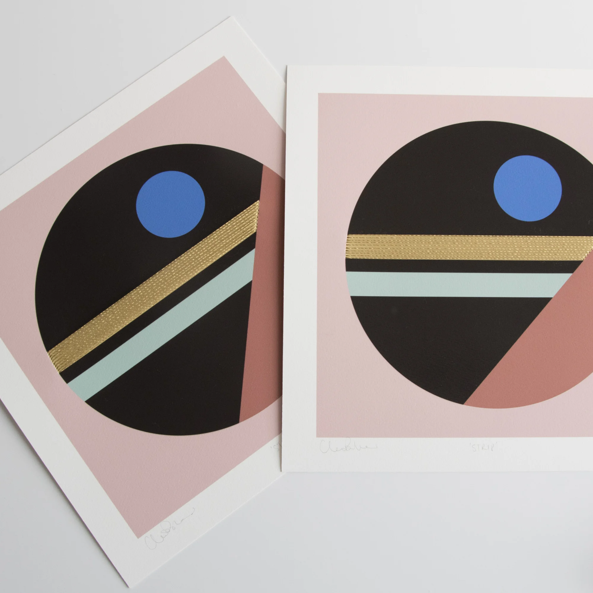My abstract geometric series takes inspiration from Art Deco patterns and motifs. I design the artworks digitally, experimenting with shapes and colour combinations before the printing process begins. The works are first giclée printed and then treated with various screen printed glazes to achieve different textures and finishes. I then apply hand stitched thread to the gold areas.