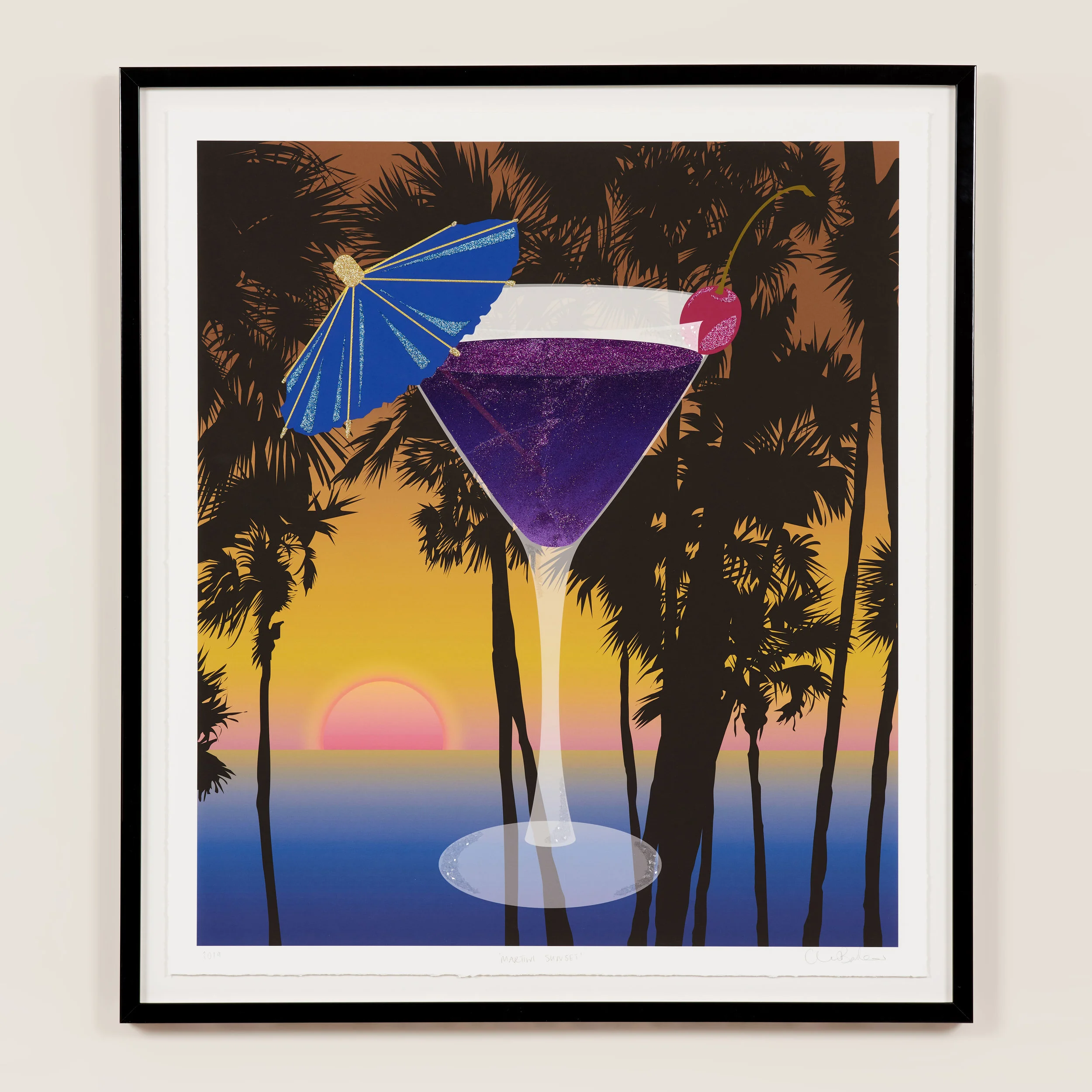 Martini sunset is a digital illustration produced as a giclée print and embellished with hand stitched gold threads, glitter and diamond dust.